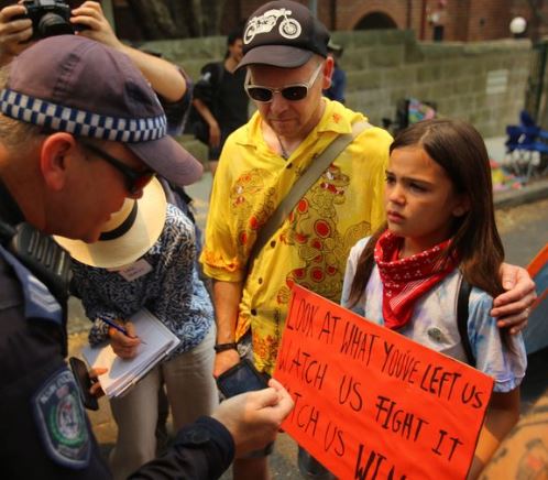 A ten year old, barely at the legal age to know right from wrong, is again in the forefront of climate protesters in Sydney.
